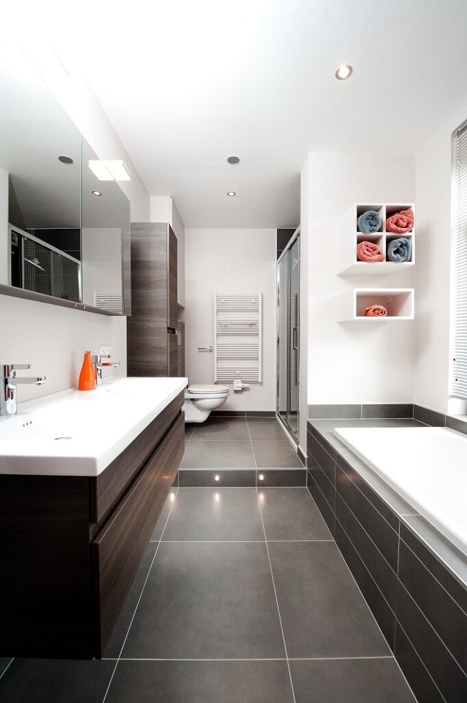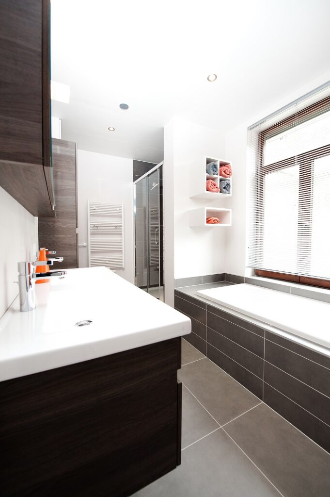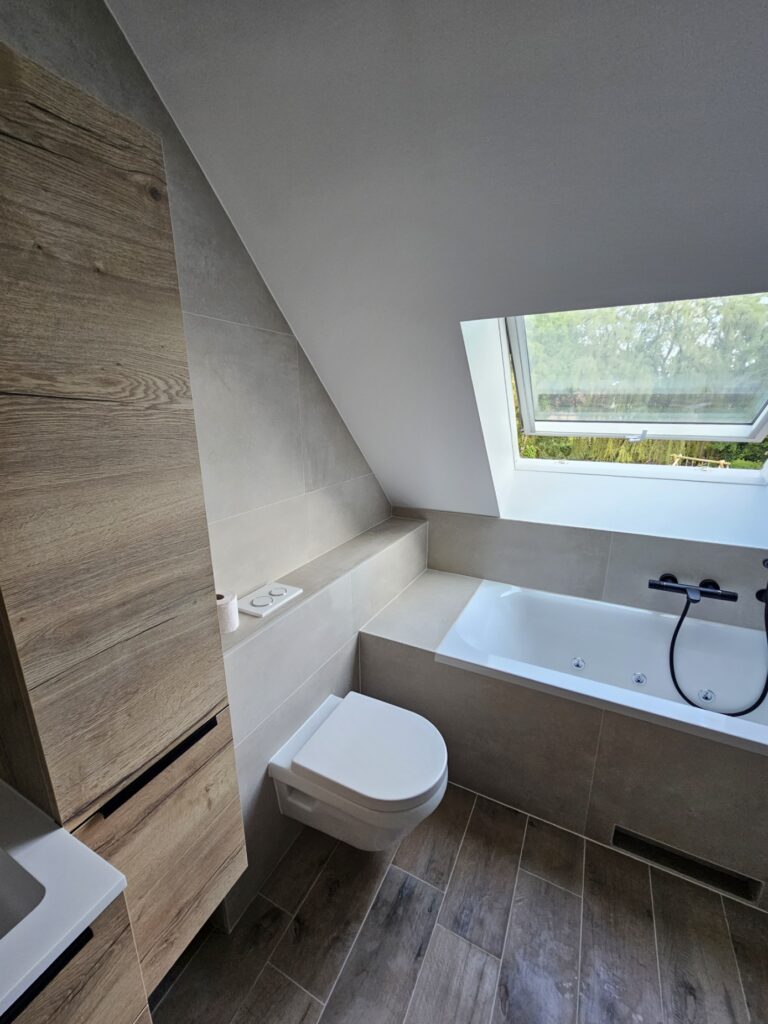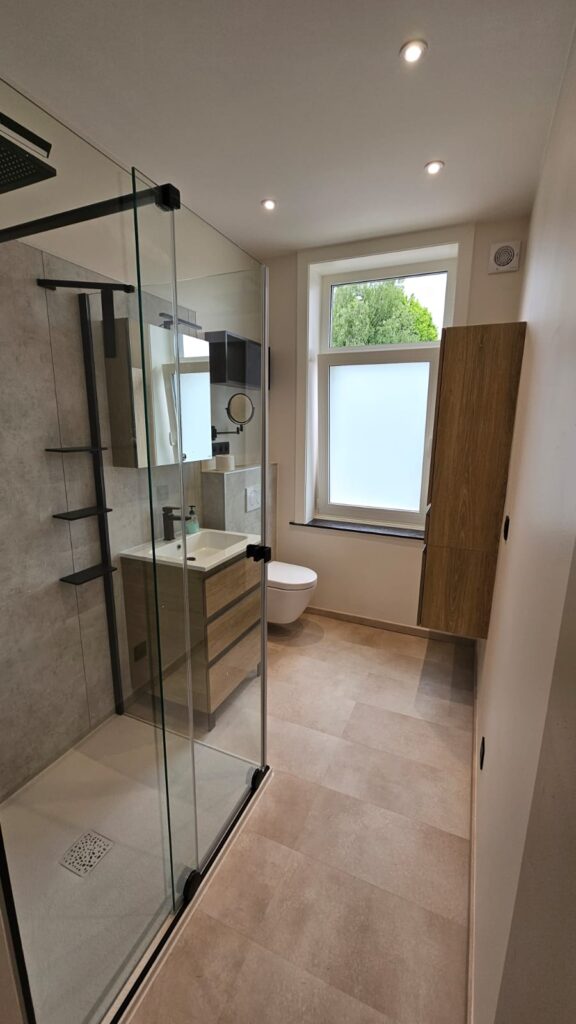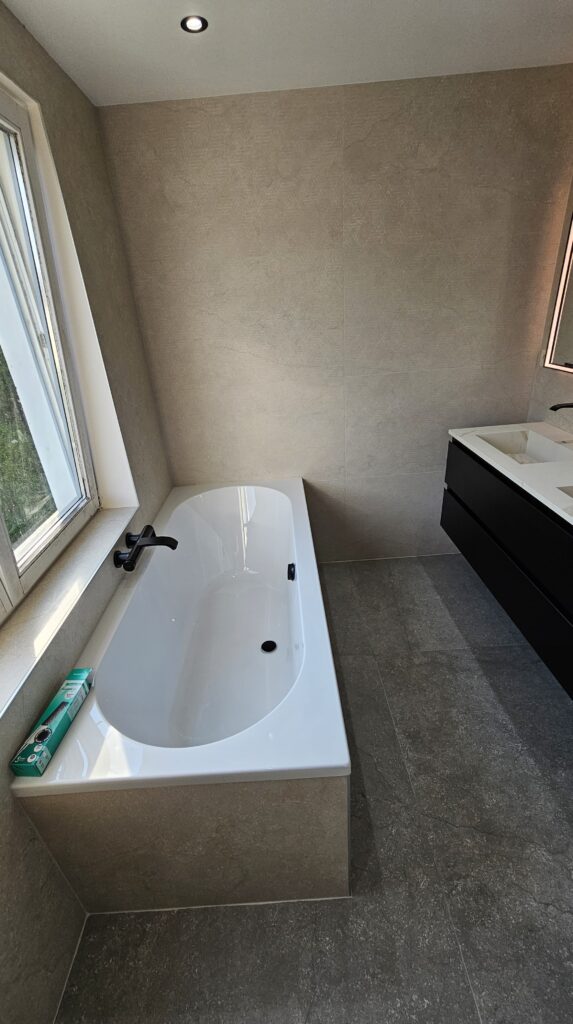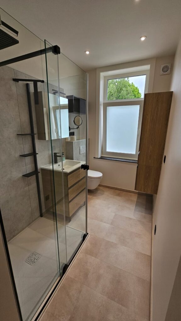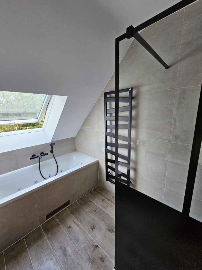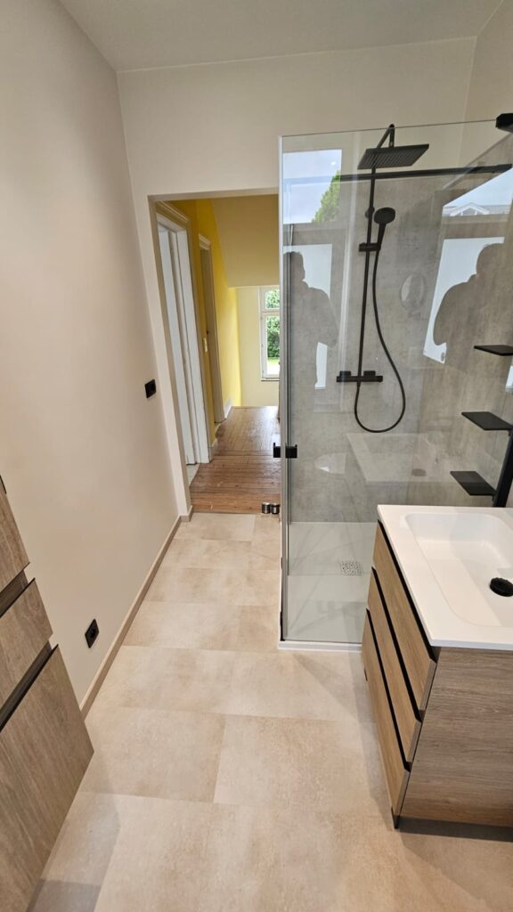 Dans cette maison unifamiliale de Genval, l’objectif était de créer une salle de bain moderne et confortable, combinant baignoire et douche.