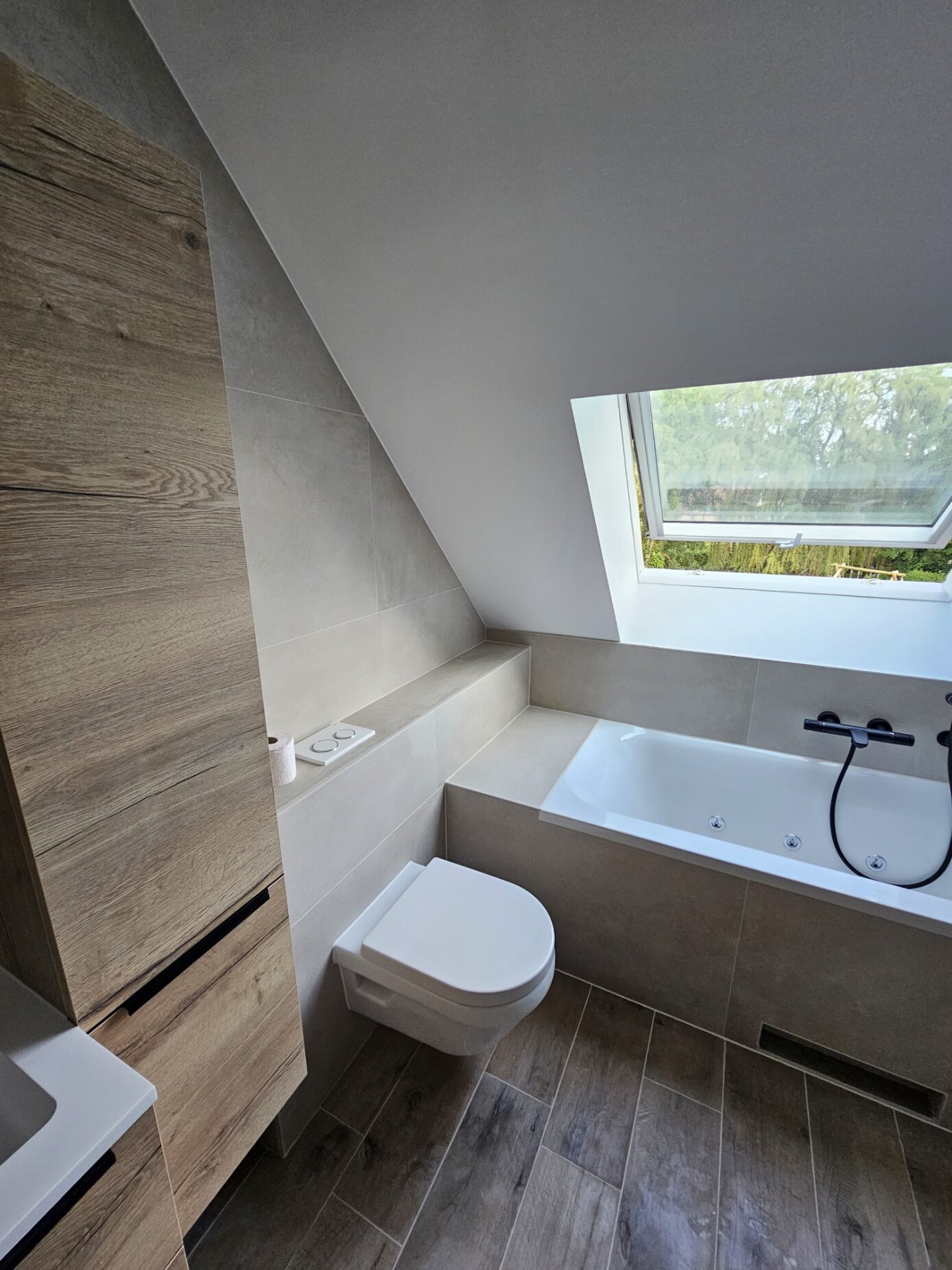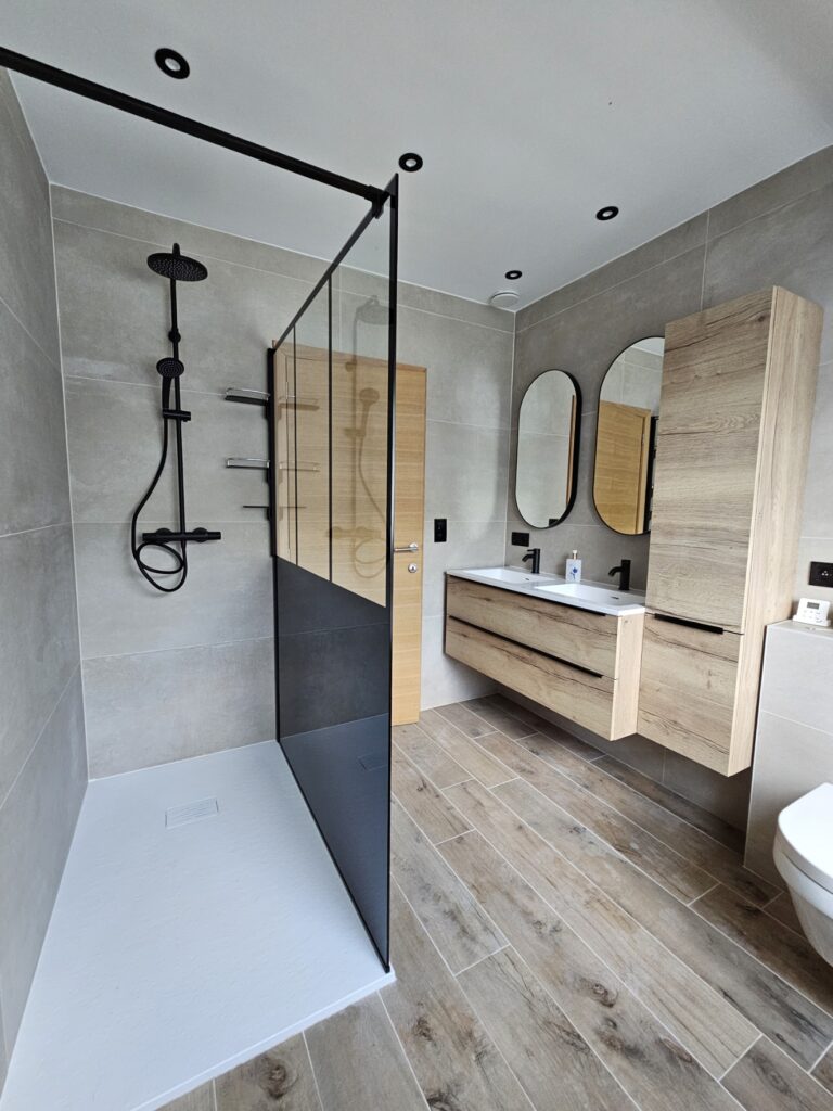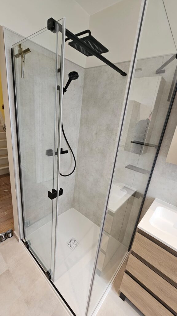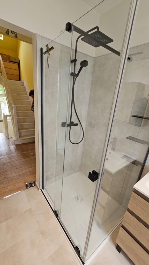 Le résultat : une salle de bain contemporaine, fonctionnelle et parfaitement adaptée aux contraintes techniques de l’étage.