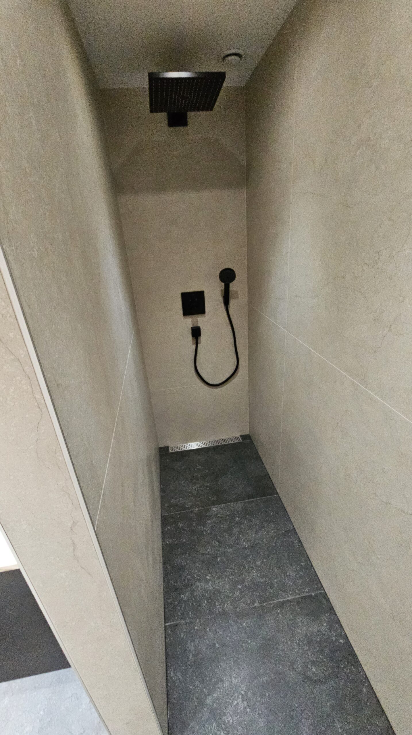 • Douche italienne carrelée, équipée d’une robinetterie encastrée Hansgrohe en finition noir mat pour un style contemporain.