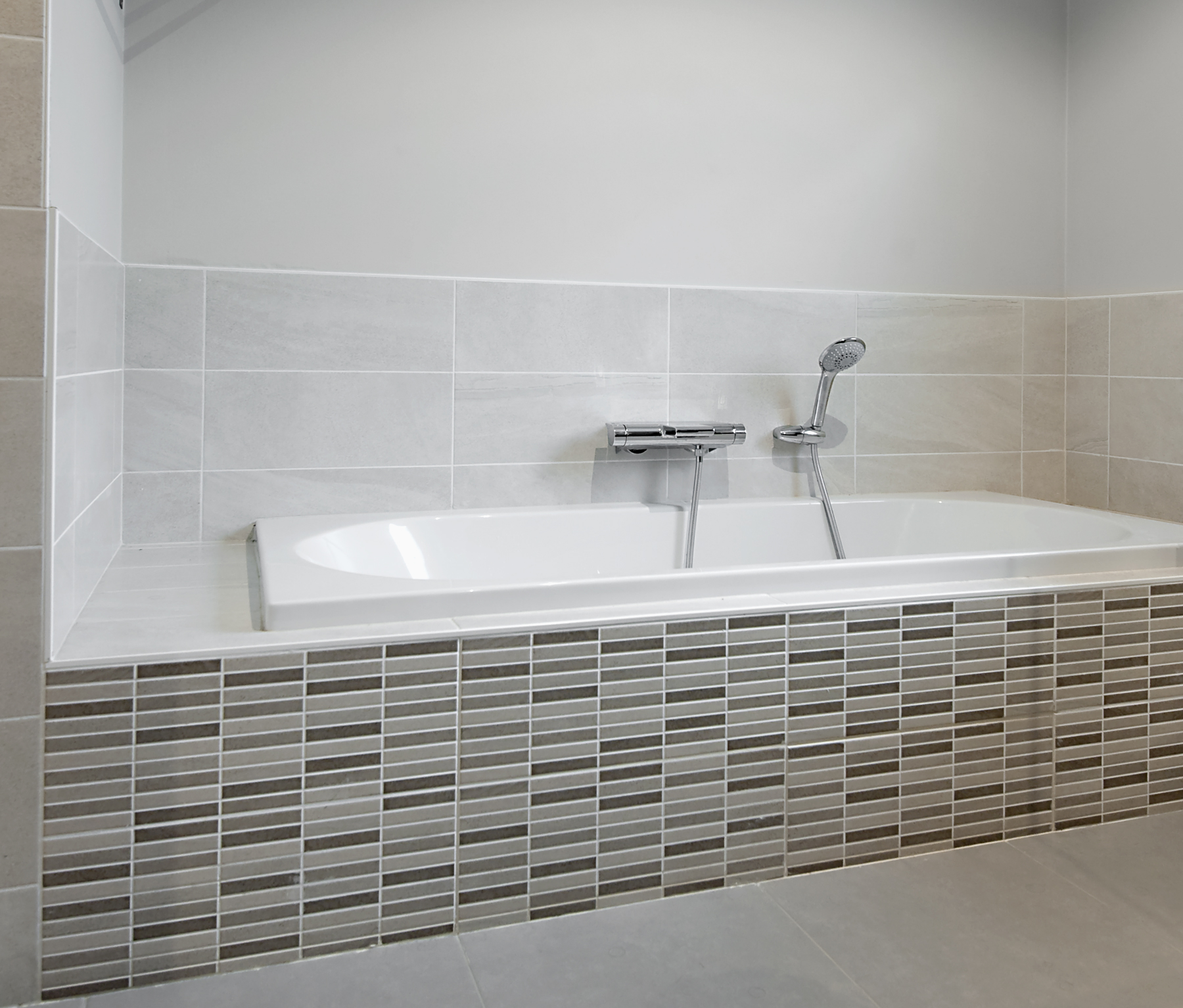 • Baignoire compacte Villeroy & Boch avec robinetterie encastrée Hansgrohe.