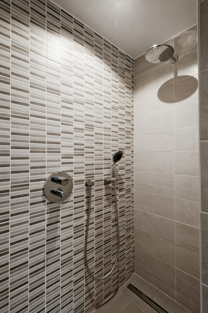 • Douche avec receveur Villeroy & Boch, habillée d’un carrelage mural élégant.