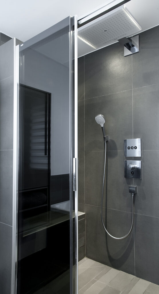 • Douche italienne entièrement carrelée, équipée d’une robinetterie encastrée pour un design sobre et élégant.