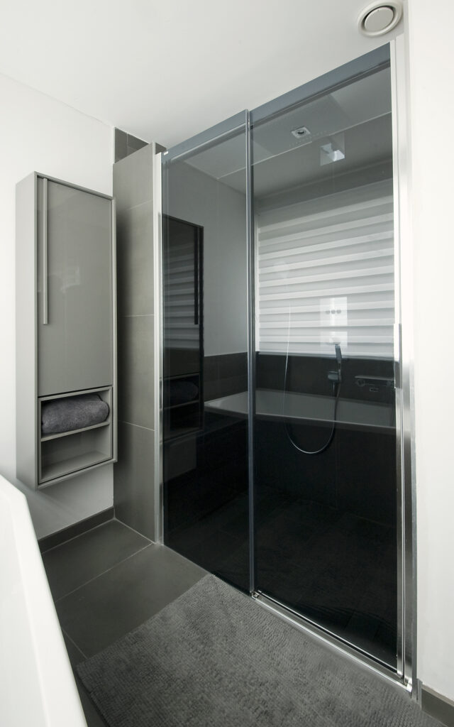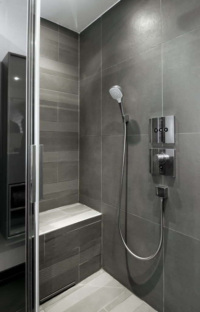 • Douche italienne carrelée au sol, équipée d’un système d’évacuation Geberit discret, intégré directement dans l’assise de la douche.