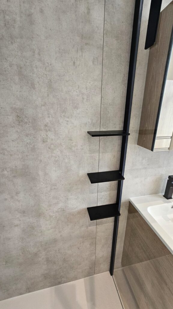 • Revêtement mural en panneaux Hüppe EasyStyle, pour un rendu moderne et sans gros travaux.